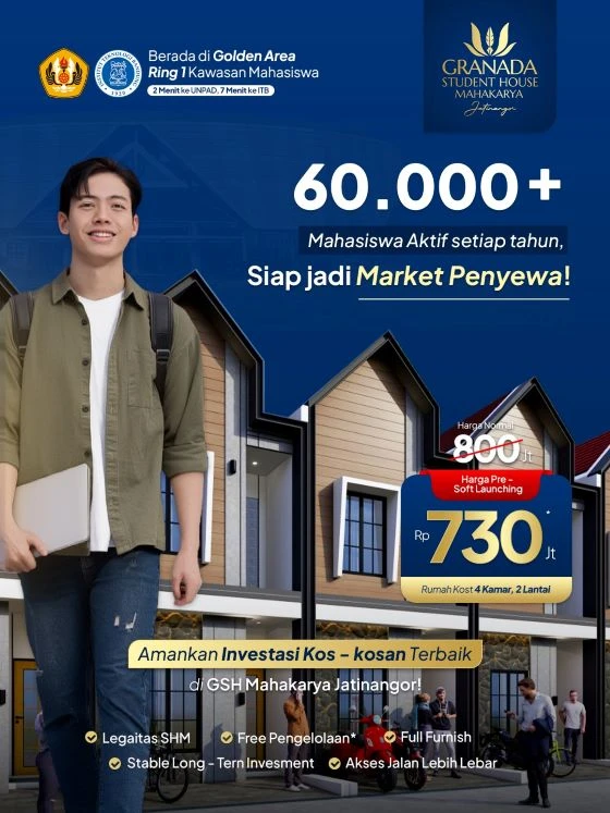 Granada Student House 2 Mahakarya Jatinangor adalah konsep investasi kost mahasiswa premium yang difokuskan untuk menghasilkan pasif income jangka panjang. Proyek ini dirancang sebagai hunian mahasiswa eksklusif dengan sistem pengelolaan profesional. Investor tidak hanya membeli properti, tetapi ikut dalam skema aset produktif yang terstruktur.