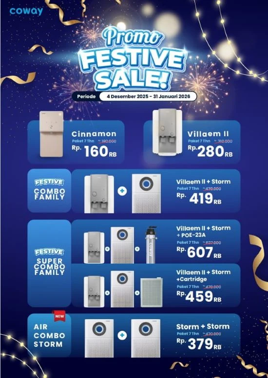 Promo Festive Sale Coway, promo Coway Desember Januari, harga Coway terbaru, Coway Cinnamon murah, Villaem II promo, Coway combo Storm, Coway resmi Indonesia